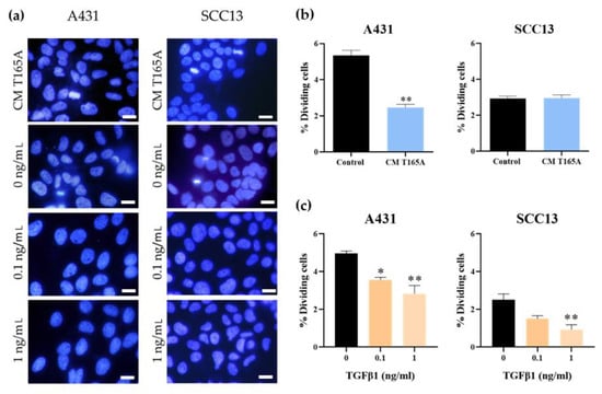 A431 and SCC13 cells were grown on glass coverslips until reaching around 70% confluence and then fixed with 3.7% formaldehide in PBS. Afterwards, cells were washed three times with PBS, permeabilized with 0.5% Triton X-100-PBS at room temperature, and incubated with Höechst for 5 min. Finally, the coverslips were mounted with ProLong®. The fluorescent signal of the nuclei was observed under the fluorescence microscope by using ultraviolet irradiation (360–370 nm, UG-1 filter, Olympus Corporation, Shinjuku, Tokyo, Japan). Dividing and non-dividing cells were counted to estimate the mitotic index and the mean +/− SEM was represented.