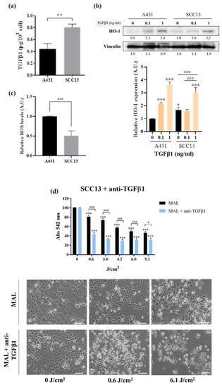37]. In fact, we found significantly different levels of endogenous TGFβ1 secreted by these two cSCC cell lines. In line with this, several authors have reported an association of the prodution of TGFβ1 with the response to PDT. More specifically, this cytokine induces an overexpression of HO-1 through the upregulation of P38 MAPK and PI3K pathways [