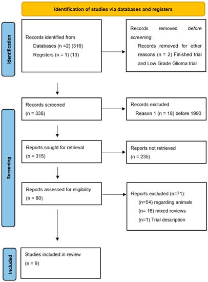 In total, 338 abstracts were screened, and 80 papers were retained for eligibility. During the review process, we searched for all reported cases where FUS was used on human patients harboring intracranial HGG. Research not involving HGG patients treated with focused ultrasound (5 articles) and before 1990 (18 articles) did not meet the inclusion criteria. Seventy-one articles were excluded, considering that 54 reported non-human research, 16 were mixed reviews on FUS in neurosurgery and one was a trial description. The references of the selected studies were checked to find all possible related articles (Figure 1). A large research was made on purpose at the beginning of the review process to prevent possible lack of eligible studies, which on a small pool of reported patients would have generated a major selection bias. No statistical analysis was performed.