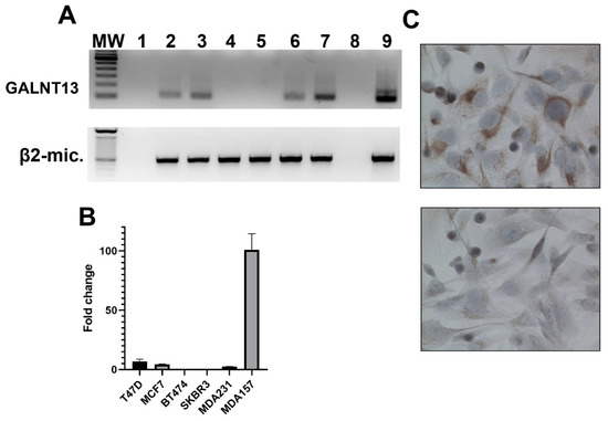 GalNAc-T13 expression in human breast cancer cell lines. (A) Nested reverse-transcription PCR amplifying a 105 bp fragment of GALNT13 mRNA and one-round reverse-transcription PCR amplifying a 596 bp fragment of β2-microglobulin as cDNA quality control: MW, 100 bp DNA ladder (Thermo Fischer); 1, master-mix negative control; 2, T47D; 3, MCF7; 4, BT474; 5, SKBR3; 6, MDA-MB-231; 7, MDA-MB-157; 8, ultrapure water as negative control; 9, Hela cell line as positive control. (B) Quantitative real-time PCR for the same breast cancer cell lines. (C) Immunocytochemistry evaluating GalNAc-T13 expression at the protein level in MDA-MB-157 cell line in the upper image and negative control in the lower image (magnification: 400×).