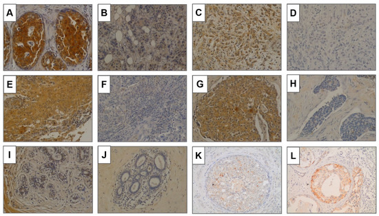 GalNAc-T13 expression in breast tissues. (A,B) Positive and negative expression, respectively, in invasive ductal carcinoma. (C,D) Positive and negative expression in lobular carcinoma. (E,F) Positive and negative expression in invasive carcinoma with medullary features. (G,H) Positive and negative expression in carcinoma with neuroendocrine features. (I,J) Normal breast tissue adjacent to breast cancer. (K,L) Ductal carcinoma in situ of low grade and high grade. Magnification of all pictures: 200×.