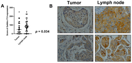 GalNAc-T13 expression in primary breast tumors and lymph node metastasis. (A) Comparison of mean expression of GalNAc-T13 by primary tumors and metastatic lymph nodes (p = 0.034). (B) GalNAc-T13 immunostaining in primary tumors and corresponding lymph node metastasis (400× magnification).