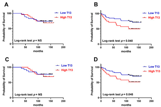 Kaplan–Meier overall survival rates related to GalNAc-T13 expression. (A) Early stage tumors (stages I and IIA) (n = 59). (B) Advanced stage tumors (stages IIB and III) (n = 75). (C) Patients without lymph node involvement (n = 47). (D) Patients with metastatic lymph nodes (n = 87).