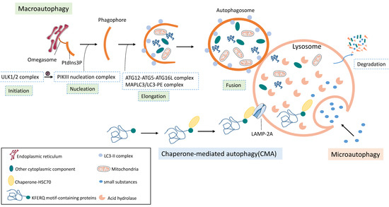 Autophagy is a highly conserved cellular process of catabolism that degrades cytoplasmic components. Depending on the type of cargo and delivery method, autophagy can be classified as macroautophagy, microautophagy, and chaperone mediated autophagy. Macroautophagy (hereafter termed autophagy) is a “bulk” degradation of large cytoplasmic materials that are engulfed by autophagosomes, which fuse with lysosomes for degradation [63]. Microautophagy involves the direct sequestration of relatively small cytoplasmic substances into lysosomes through invagination of the lysosomal membrane [64]. Chaperone mediated autophagy (CMA) is a highly selective pathway in which chaperone-HSC70 recognizes the KFERQ motif-containing proteins and targets the substrate to the lysosome surface. Then, this substrate protein-chaperone complex binds to lysosome-associated membrane protein type 2A (LAMP-2A) to access the lysosome for degradation [65] (Figure 1).
