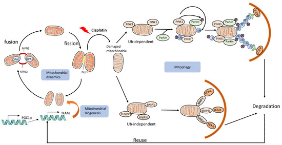 Mitochondria are dynamic organelles that sustain their shape or morphology via two opposing processes, fission mediated by Drp1 and fusion regulated by mitofusin 1 (MFN1), MFN2, and OPA1 [83]. Mitophagy is a form of selective autophagy whereby dysfunctional mitochondria are degraded via autophagy. Mitochondrial dynamics and mitophagy are intimately related to each other. In 2009, our group reported that mitochondrial fragmentation occurred in kidney injury induced by renal ischemia-reperfusion and cisplatin, which was ameliorated by a pharmacological inhibitor of Drp1 [83]. It is also verified by one study using intravital multiphoton microscopy in live animals [84]. Of interest, it is observed that Drp-1-mediated mitochondrial fission also facilitated mitophagy during cisplatin treatment of renal tubular cells [85]. Although it is unclear whether mitochondrial fission can directly trigger mitophagy, fission-associated ROS overproduction and related signals may at least work together to induce mitophagy [86].