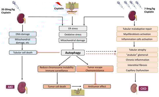 Autophagy in cisplatin-induced nephrotoxicity during cancer therapy. In kidneys, autophagy protects tubular cells against acute kidney injury induced by cisplatin. Autophagy may also affect the development of CKD through its regulation of tubular atrophy, interstitial fibrosis, etc. In cancers, autophagy may suppress tumorigenesis, but it increases the resistance of cancer cells to cisplatin chemotherapy.