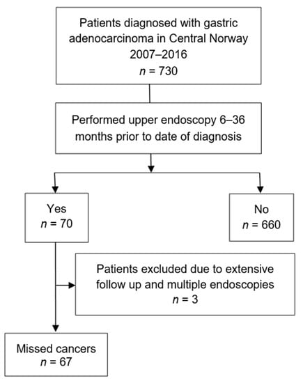 Gastric adenocarcinoma is one of the most common cancers worldwide [1]. In Western populations, there has been a steep decline in incidence of adenocarcinomas of Lauren’s intestinal type, paralleling the prevalence of Helicobacter pylori (H. pylori) [2,3]. However, the incidence of Lauren’s diffuse-type cancers has increased over several decades [2], and there is also an increasing incidence of non-cardia gastric cancers in younger cohorts, particularly those located in the gastric corpus and fundus [4]. Gastric cancer has a high lethality, and early diagnosis is the most important factor that affects survival. However, the majority of the patients are diagnosed with advanced disease, and surgery is curative in only a minor proportion [5]. Screening programs have therefore been implemented in countries with a relatively high incidence of gastric cancer, where individuals at moderate to high risk are examined with upper endoscopy to diagnose early gastric cancer and preneoplastic lesions [6]. The use of high-definition endoscopes, enhanced imaging techniques [7,8] and longer inspection time [9] are associated with higher detection rates of both cancer and preneoplastic lesions [6,7,8]. A clinically relevant and highly robust quality indicator of upper endoscopies is the diagnosis of cancer after a procedure. The term interval gastric cancer encompasses cancers diagnosed between scheduled endoscopies within a screening program, whereas in Western countries without a screening program, cancers diagnosed within a defined period after upper endoscopy have been termed missed gastric cancer (MGC) [10,11]. The rates of MGC have previously been reported between 4.7% and 9.8% in Western countries [10,12]. It is therefore of interest to identify factors associated with MGC, and characteristics of the gastric lesion, the patient and the endoscopist have been proposed [13]. The aim of this population-based study was to calculate the rate of missed gastric cancers in Central Norway as well as to identify factors associated with missed gastric cancers.