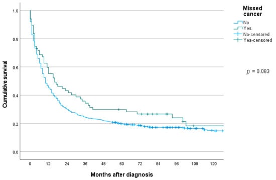 The median survival in patients with missed gastric cancer was significantly better compared to controls, 16 months (95% CI 5.7–26.3) vs. 10 months (95% CI 8.3–11.7), p = 0.036. Kaplan–Meier survival curves showed a similar, but non-significant trend, log-rank test p = 0.083 (Figure 2). In a Cox multivariable analysis adjusting for age, sex, TNM stage, Lauren type and localization, interval cancer was not significantly associated with risk of death, HR 1.16 (95% CI 0.87–1.55), p = 0.327.