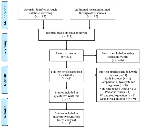 - Hutton, B.; Salanti, G.; Caldwell, D.M.; Chaimani, A.; Schmid, C.H.; Cameron, C.; Ioannidis, J.P.; Straus, S.; Thorlund, K.; Jansen, J.P.; et al. The PRISMA extension statement for reporting of systematic reviews incorporating network meta-analyses of health care interventions: Checklist and explanations. Ann. Intern. Med. 2015, 162, 777–784. [Google Scholar] [CrossRef] [PubMed] [Green Version]