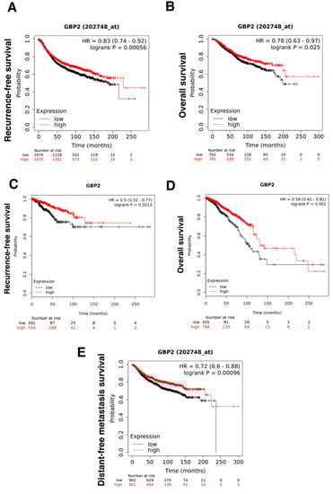- Godoy, P.; Cadenas, C.; Hellwig, B.; Marchan, R.; Stewart, J.D.; Reif, R.; Lohr, M.; Gehrmann, M.; Rahnenführer, J.; Schmidt, M.; et al. Interferon-inducible guanylate binding protein (GBP2) is associated with better prognosis in breast cancer and indicates an efficient T cell response. Breast Cancer 2012, 21, 491–499. [Google Scholar] [CrossRef]