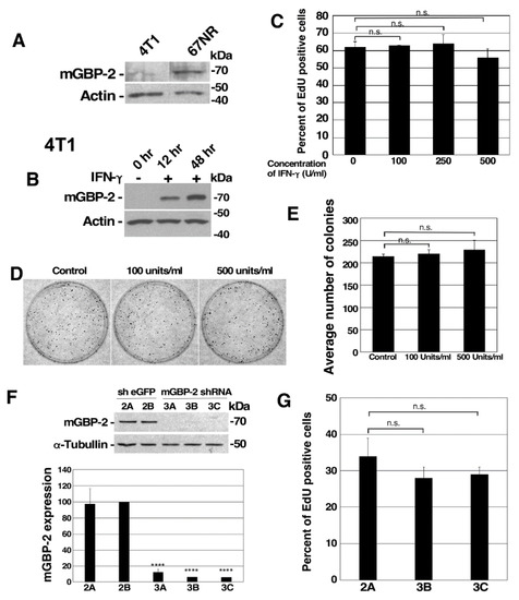 To determine if mGBP-2 inhibits breast cancer cell proliferation, 4T1 cells were treated with IFN-γ to induce the expression of mGBP-2 (Figure 2B) and the cells were examined for changes in proliferation (Figure 2C–E). Interferon treatment to increase mGBP-2 does not alter 4T1 proliferation as measured by EdU incorporation (Figure 2C) or colony formation (Figure 2D,E). Whether reducing the amount of mGBP-2 in 67NR cells would promote their proliferation was also examined (Figure 2F). 67NR cells were stably transfected with constructs containing either shRNAs against eGFP or shRNAs against mGBP-2 and stable pools of cells were isolated (Figure 2F). 67NR cells 3B and 3C showed greater than 90% knockdown of mGBP-2 (Figure 2F) and were used for subsequent experiments and designated KD#1 and KD #2 respectively. 67NR cells 2A with eGFP shRNA were designated as controls. These cells were examined for changes in proliferation (Figure 2G). Knocking down mGBP-2 in 67NR cells did not alter their proliferation. Together these data indicated that mGBP-2 does not inhibit the proliferation of these murine breast cancer cells.