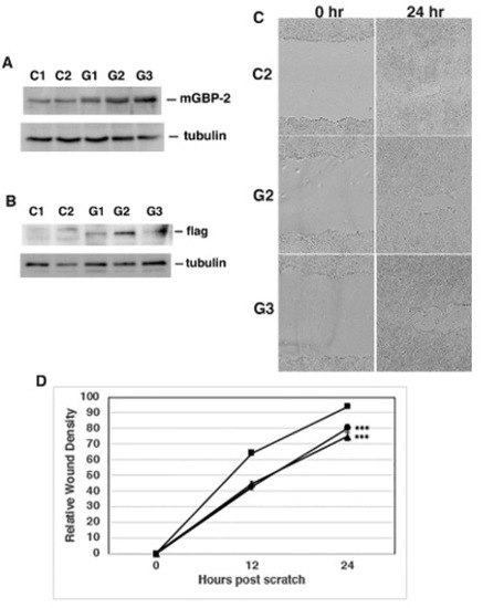 GBP-2 inhibits 4T1 cell migration. 4T1 cells were infected with lentivirus expressing flag-tagged GBP-2 as described in Methods. Cell lysates from two cell lines with control lentivirus (C1 and C2) and three lines (G1, G2, G3) with flag-tagged mGBP-2 were probed with either a polyclonal antisera (1851) against GBP-2 (panel A) or anti-Flag (panel B) and anti-α-tubulin. Representative images are shown (n = 2). (C). 4T1 cells ± GBP-2 were analyzed by wound healing assay for changes in migration, as described in Methods. Representative photomicrographs of wounds generated by scratch in C2, G2, and G3 cell monolayers at 0 and 24 h post scratch are shown at 10× magnification. (D). Results are presented as mean relative wound density ± SEM (n = 2; ***, p < 0.001). A square designates C2, a circle designates G2, and a triangle designates G3.