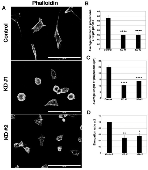 Cells (4 × 104) were plated on 12-mm coverslips in duplicates in 24-well dishes and serum starved for 3 h before adding warm 10% FBS in DMEM for 20 min. Cells were fixed with 4% paraformaldehyde for 10 min at RT, permeabilized with 0.2% Triton X-100 for 10 min at RT, and washed with PBS. The cells were blocked with 0.5 mL antibody (Ab) dilution buffer (PBS containing 0.05% Tween 20, 3% BSA, 5% glycine) with 10% nonimmune horse serum at room temperature for 1hr. Next, 100 µL of diluted Alexa fluor 594 phalloidin (Molecular Probes, Eugene, OR, USA) in Ab dilution buffer with no horse serum (1:200) was added and incubated overnight. Cells were washed with PBS and stained with 150 nM DAPI for 5 min at RT. Coverslips were mounted with Permount-G (SouthernBotech). Random fields per coverslip were imaged at 20× and 40× on an EVOS FL Inverted Microscope (Thermofisher) using DAPI and Texas Red filters. The images were loaded onto ImageJ software and 100 cells per condition were used to measure parameters that included surface areas, elongation ratios, number of projections and length of projections.