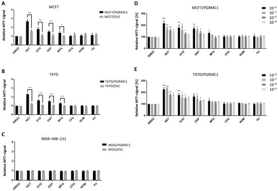As already shown in previous studies, PGRMC1 represents a potential integration point and transmitter of progestin signals responsible for the growth and proliferation of breast cancer cells [,]. To further study this effect, we used the HA-tagged PGRMC1-overexpressing breast cancer cell lines MCF7/PGRMC1, T47D/PGRMC1 and MDA-MB-231/PGRMC1 as well as the respective empty vector control cell lines MCF7/EVC, T47D/EVC and MDA-MB-231/EVC, and performed the MTT assay to measure activated metabolism as surrogate for cell proliferation upon treatment with various progestins used in CHT. For the ERα/PR positive cell lines MCF7/PGRMC1 and T47D/PGRMC1, treatment with the progestins NET, DYD and DSP (10−6 M) significantly increased cell proliferation compared to the respective EVC cells while no effects were observed after treatment with CPA, NOM and P4 (10−6 M) (Figure 1A,B). For MCF7/PGRMC1 cells, significantly higher proliferation was also observed after treatment with MPA (10−6 M). In contrast, treatment of PGRMC1-overexpressing MDA-MB-231 cells with any progestin (10−6 M) or P4 (10−6 M) did not increase their proliferation compared to MDA-MB-231/EVC cells (Figure 1C), suggesting that progestin-mediated PGRMC1 signaling is mediated by proteins which are expressed in the HR positive cell lines MCF7 and T47D, but not in the triple-negative cell line MDA-MB-231.