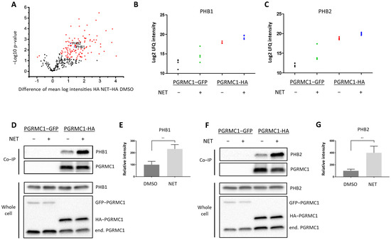 The results from mass spectrometry were verified by Co-IP followed by Western blot analysis. Both PHB1 (Figure 2D,E and Figure S13) and PHB2 (Figure 2F,G and Figure S14) exhibited significantly higher signals in MCF7/PGRMC1 cells after NET treatment. These results indicate augmented interaction of PHB1 and PHB2 with protein complexes containing PGRMC1 in the presence of NET compared to DMSO treatment.
