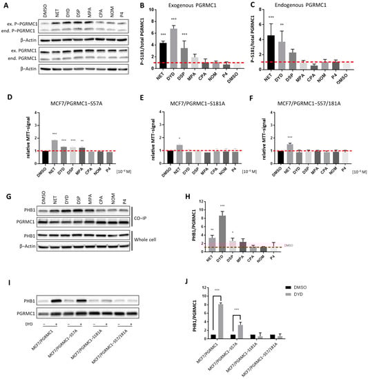 Regarding the interaction between ERα and PHB1 or PHB2, we obtained the inverse picture: treatment with NET or DYD led to significantly less interactions than the treatment with P4 or DMSO (Figure 4A,B and Figure S5A,B, T47D in Figure S7A–D), while the protein expression levels of all tested proteins remained unchanged (Figure S10).