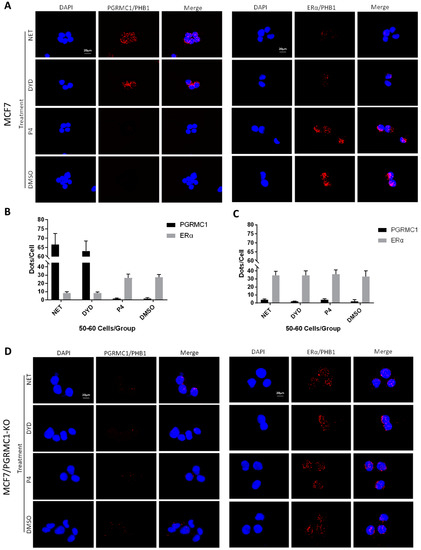 Since PHB1 and PHB2 were reported to regulate ERα signaling, which is a central oncogenic pathway in luminal breast cancer, we focused on the implication of PGRMC1 in the ERα signaling network and its possible involvement in breast cancer promotion. According to literature, PHB2 directly interacts with ERα and represses its transcriptional activity []. Therefore, we investigated the associations between endogenously expressed PGRMC1 and PHBs or ERα and PHBs, respectively, by PLA in parental MCF7 and T47D cells-independent of overexpression and immunoprecipitation. For this experiment, NET and DYD were used representatively for the PPP group while P4 and DMSO served as controls. Upon treatment with NET and DYD, a significantly higher number of PLA interactions between PGRMC1 and PHB1 (Figure 4A,B) or PHB2 (Figure S5A,B) could be observed in both cell lines compared to treatment with P4 and DMSO (T47D in Figure S7A–D).