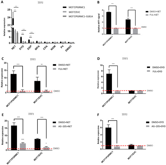Further, in order to verify that the proliferative effect observed after treatment with PPPs correlated with TFF1 expression and ERα activation, we pre-treated the same cell lines with the selective ERα-degrader fulvestrant [] before the stimulation with NET or DYD. As expected, degradation of ERα before progestin treatment (for confirmation of ERα-degradation, see Figures S12, S26 and S27) resulted in diminished TFF1 expression (Figure 5C,D). In addition, the proliferative effect of NET was completely abolished after pre-treatment with fulvestrant, validating that the progestin-dependent increased breast cancer cell viability is conveyed through the ERα signaling pathway (Figure 5B). To further elucidate the role of PGRMC1 in progestin-dependent ERα activation, we pre-treated MCF7/PGRMC1 and MCF7/EVC cells with the putative PGRMC1 inhibitor AG-205 [,]. AG-205 antagonizes some PGRMC1 functions but also has PGRMC1-independent effects []. Treatment with AG-205 before the stimulation with NET or DYD representatively for PPPs completely abolished the increase of TFF1 expression in both cell lines for DYD and significantly diminished the same for NET, indicating an essential role of PGRMC1 in progestin-dependent ERα activation (Figure 5E,F).