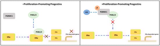 In the present study, we demonstrated that PGRMC1 may represent a regulating factor in the PHBs-ERα-interplay. Stimulation with PPPs increased the association between PGRMC1 and PHBs, which reduced the interactions between PHBs and ERα. A potential mechanism may be that this results in a reduced capability of PHBs inhibit ERα transcriptional activity in the promoter regions of ER-target genes (Figure 6). Indeed, the PLA between the different proteins using NET and DYD representatively for the group of PPPs and P4 and DMSO as controls revealed significantly reduced interactions between ERα and PHBs and significantly elevated ERα activation (measured as TFF1 transcription level) upon treatment with NET and DYD. This finding points towards an indirect stimulatory effect on ERα by PGRMC1 via neutralization of the inhibitory effect of PHBs. A similar role has been reported for the brefeldin A-inhibited guanine nucleotide-exchange protein 3 (BIG3) which binds PHB2 to prevent its translocation into the nucleus, and thereby acts as an ERα coactivator [,,].