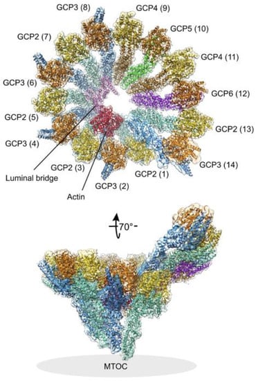 - Liu, P.; Würtz, M.; Zupa, E.; Pfeffer, S.; Schiebel, E. Microtubule nucleation: The waltz between γ-tubulin ring complex and associated proteins. Curr. Opin. Cell Biol. 2021, 68, 124–131. [Google Scholar] [CrossRef] [PubMed]