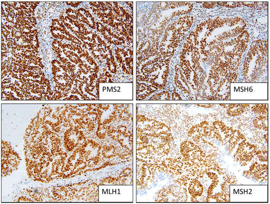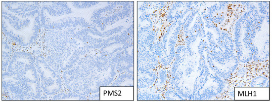 Example of MMRd staining patterns; loss of expression of MLH1 and PMS2.
