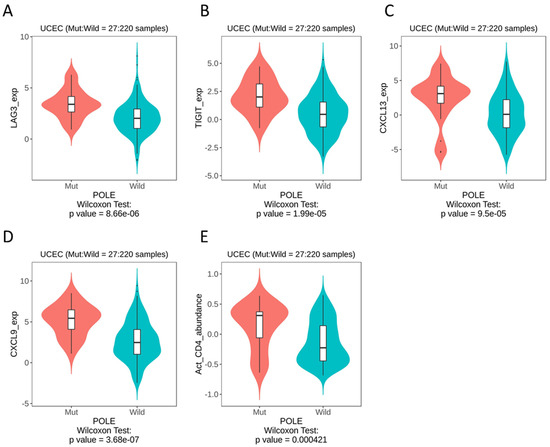 TISIDB datamining in UCEC, POLE mutation vs. wild-type, immune gene expression. (A) LAG3. (B) TIGIT. (C) CXCL13. (D) CXCL9. (E) Activated CD4 T cells.