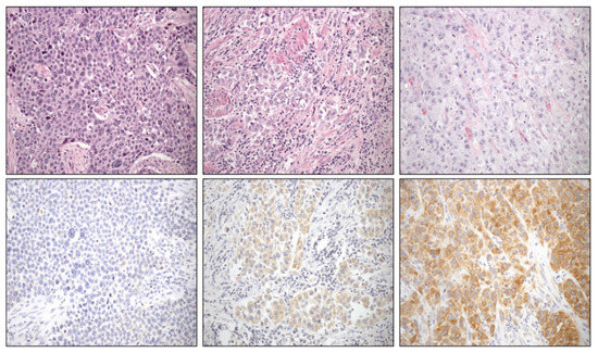 High-grade urothelial carcinomas with their respective prorenin immunostaining (lower row) quantified as absent (left), weak (middle), and intense (right) (original magnification in all cases × 250).