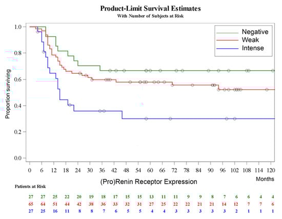 Kaplan–Meier curve of disease-specific survival according to the immunohistochemical expression of prorenin receptor (absent, weak, and intense) in patients with urinary bladder cancer treated by cystectomy; log-rank, p = 0.008.