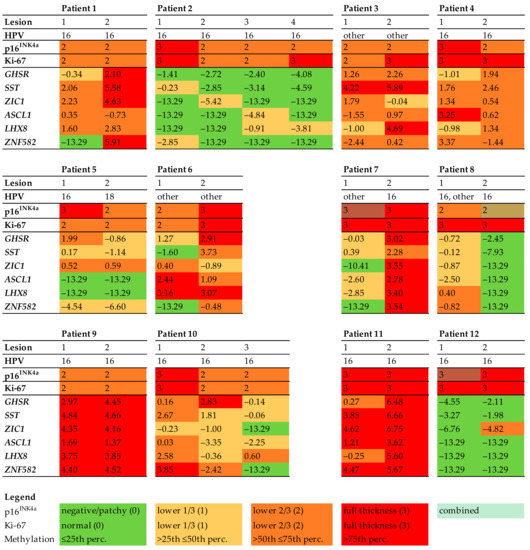 Histopathology and biomarker profiles in 12 patients with multifocal HSIL. Immunohistochemical scores for p16INK4a (0–3) and Ki-67 (0–3), high-risk HPV genotypes, and log2 transformed methylation levels of all HSILs. DNA methylation levels for all genes (GHSR, SST, ZIC1, ASCL1, LHX8, and ZNF582) were categorized into quartiles. Each column represents one HSIL. The colours refer to the biomarker expression, as indicated in the legend. Abbreviations: HPV = human papillomavirus.