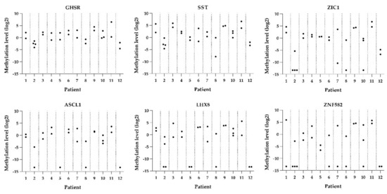 Methylation levels per lesion per patient for all six genes (GHSR, SST, ZIC1, ASCL1, LHX8, and ZNF582).