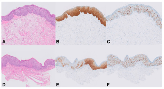 Staining patterns for p16INK4a in HSIL. Patient 8, HSIL 1: (A) H&E stain (20×); (B) homogeneous p16INK4a staining, score 3 (20×); (C) full-thickness immunostaining of Ki-67, score 3 (20×). Patient 8, HSIL 2: (D) H&E stain (20×); (E) combined diffuse and patchy p16INK4a staining, score 2 (20×); (F) full-thickness immunostaining of Ki-67, score 3 (20×).
