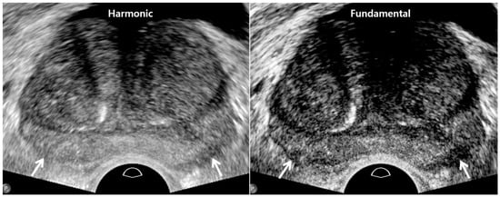 A 74-year-old man with high PSA (4.68 ng/mL): harmonic imaging (left figure) provides higher resolution compared to fundamental imaging (right figure). However, tissue contrast is clearer in fundamental imaging than harmonic imaging. As a result, posterior capsule (white arrows) is better depicted in fundamental imaging.