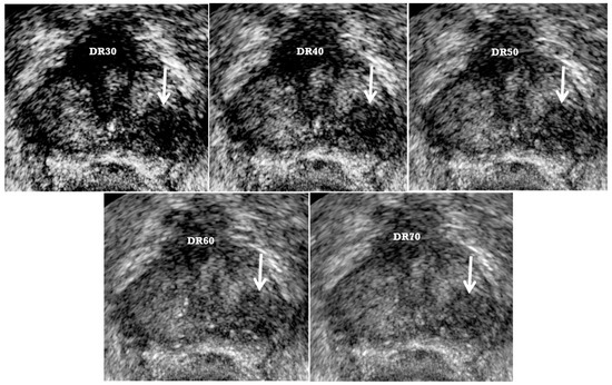 A 73-year-old man with high PSA (5.31 ng/mL): as dynamic range (DR) decreases from 70 to 30, a tumor (white arrow) becomes clear because of increasing tissue contrast. Subsequently, radiologists or urologists can detect and target it easily. The numbers of target and systematic cores were 4 and 4, respectively. Adnocarcinoma was confirmed with only target biopsy. The highest Gleason scores of tumor center and periphery were 8 (4 + 4) and 9 (4 + 5), respectively. Good lesion depiction could reduce the number of cores compared to 12-core systematic biopsy. However, as the DR decreases, gray-scale images becomes coarse because of decreasing tissue resolution. We recommend that the DR should be maintained from 40 to 50.
