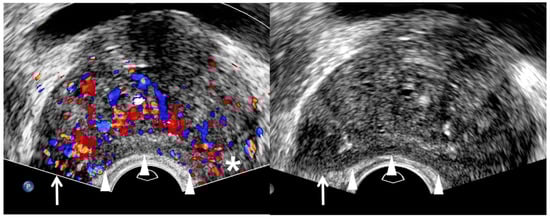 A 75-year-old man with high PSA (14.75 ng/mL): color Doppler TRUS image (left figure) shows a hypervascular area (white arrow) in the right mid-gland compared to the contra-lateral area (asterisk) in the left mid-gland. However, the right lesion is not clearly shown. Therefore, the tumor shape is completely depicted on gray-scale TRUS (right figure) when the tip of TRUS transducer is slightly moved to the right prostate. It is a hypoechoic tumor, which is projecting out from the capsule, suggesting extracapsular extension. White arrowheads indicate that the posterior capsule is compressed by a transrectal transducer, resulting in banana-shape deformity of the prostate. TRUS-guided target biopsy confirmed GS 8 (4 + 4) and post-biopsy MRI showed a T3a prostate cancer with right extra-capsular extension.