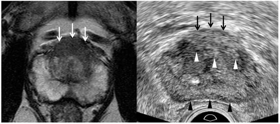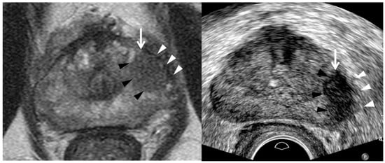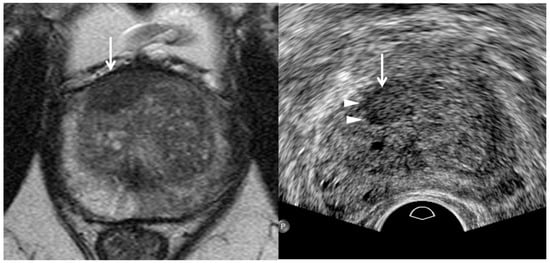 A 73-year-old man with high PSA (5.48 ng/mL): T2-weighted MR image (left figure) shows a 0.9 cm PI-RADS 4 transition lesion (white arrow) in the anterior right base. The tumor looks lenticular and homogeneous. In contrast, TRUS image (right figure) shows that it is detected in the anterior right mid-gland. It is slightly hyperechoic and a hypoechoic rim (white arrowheads) is detected at the right margin of the tumor. The histologic diagnosis was adenocarcinoma with GS 6 (3 + 3) with target biopsy.