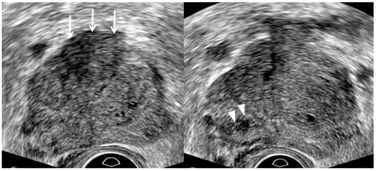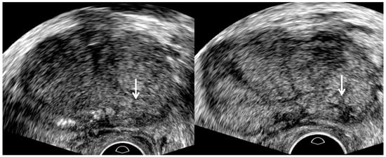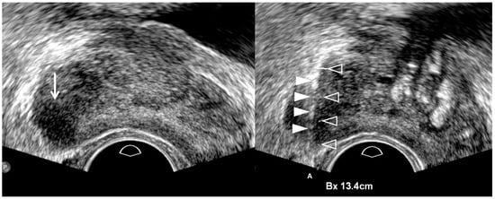Other TRUS features suggesting significant cancers include increasing tumor size and heterogeneous echotexture (Table 2) (Figure 2, Figure 3, Figure 4, Figure 5, Figure 6, Figure 7 and Figure 8) [27,43]. The significant cancer detection rate in a small PI-RADS 4 lesion, which is less than 1 cm, is lower than that in a larger PI-RADS 4 lesion [43]. The tumor size is also an independent factor for differentiating PI-RADS 4 and 5 lesions. As a PI-RADS score increases, the tumor may have higher GSs, which makes their echotexture heterogeneous because of gland fusion, absent stroma, absent glands, and tumor necrosis [44]. Therefore, tumors with increasing GSs are supposed to become heterogeneous in echotexture (Figure 2, Figure 3, Figure 4, Figure 5, Figure 6, Figure 7 and Figure 8).