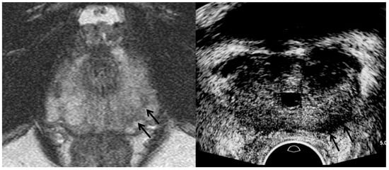 A 67-year-old man with high PSA (4.47 ng/mL): T2-weighted MR image (left figure) shows a PI-RADS 4 peripheral lesion (black arrows) in the left apex. However, TRUS image (right figure) shows it is a hypoechoic tumor (black arrows) in the left base. The tumor shape looks thicker on TRUS image compared to MR image. The tumor size on TRUS image is not identical on MR image, either. A great care should be taken to understand the difference between MRI and TRUS in terms of tumor location, shape, and size.