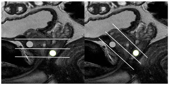 Second, a lesion on TRUS appears more superiorly than that on MRI as it becomes closer to the posterior capsule (Figure 8) [24,25,26,28,29]. However, the tumor on TRUS appears more inferiorly than that on MRI as it becomes closer to the anterior capsule. This phenomenon results from the different scan axes of TRUS and MRI (Figure 9) [45]. Generally, the scan axis of MRI is perpendicular to urethra, whereas that of TRUS is oblique to urethra. Therefore, as a lesion becomes closer to posterior capsule, it is located higher on TRUS compared to MRI. When MRI shows a tumor at the apex, TRUS shows it at the mid-gland or base. In contrast, if a lesion becomes closer to anterior capsule, it is seen lower on TRUS (Figure 4 and Figure 5). When MRI shows a tumor at the base, TRUS shows it at the mid-gland or apex. A tumor which is located around the transverse line between anterior and posterior capsules, the location is not so different between MRI and TRUS (Figure 7). Additionally, patient positions such as supine, decubitus, or knee-chest position influence differences in the apparent lesion locations between MRI and TRUS.