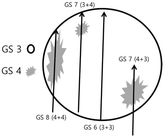 Generally, radiologists and urologists try to target the center of the tumor during a prostate biopsy (Table 4). They believe that core tissue samples from the tumor center represent the highest GS. Frequently, they obtain one or two cores from the center of a tumor. However, as the GS becomes higher, the prostate cancer becomes heterogeneous in histologic texture (Figure 2 and Figure 10) [44]. Therefore, a saturation target biopsy is reported to be useful in reducing GS underestimation [11,46,47,48]. Sampling the central area alone may miss a higher GS in the peripheral area, leading to underestimating the risk of prostate cancer (Figure 2 and Figure 10). Therefore, tissue sampling should be obtained from the peripheral area as well as the central area of the tumor. This strategy helps to reduce GS underestimation compared to that of targeting a center of the tumor alone.