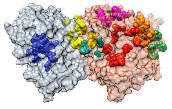 - Vinca domain (MDA, orange in Figure 2): this domain is located in the β tubulin monomer at the inter-dimer interface between two longitudinally aligned tubulin dimers. Drugs that bind to this domain inhibit the assembly of tubulin by sequestering tubulin into paracrystalline aggregates. Examples of these drugs are vincristine, vinblastine, and vindesine [,,,].