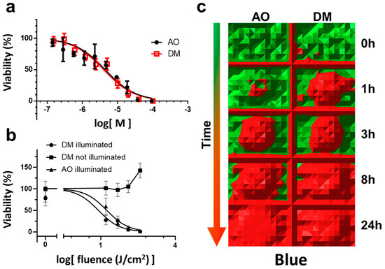 Section 3.3). Here an entire 96-well plate with 2.5 µM drug treatment (AO and DM) was used for one time-point of the phototoxic kinetic measurement (Figure 1c) applying the MTT viability assay. At one time-point, the MTT values of the middle 36 wells (the center of all 96-well plates was centered to the optical axis of the LED) of the entire plate were first normalized to the average MTT value of one full unilluminated plate of 96 wells. Then the normalized 36 values were averaged. The mean and SEM of these normalized data were plotted (y viability value) as one fluence value in Figure 1b. The irradiation value (x fluence value of Figure 1b) was calculated as a 10-base logarithm of the product of the time of illumination in seconds and the fluence rate (mW/cm