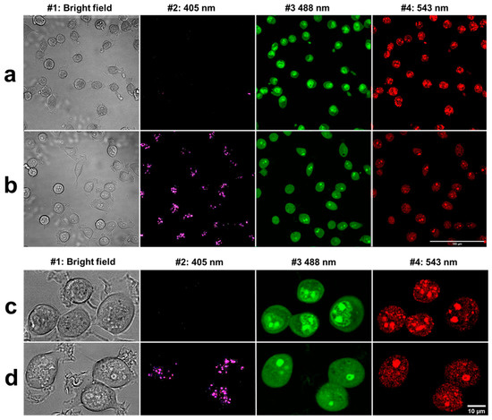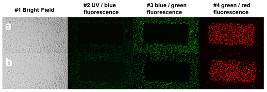 After live-cell embedding, an area of one field image was irradiated by the 488 nm laser light in each well by making images with the LSC system (Figure 6a). The illumination of the exact location and the imaging was repeated in subsequent consecutive cycles, as described above in the LSC section.