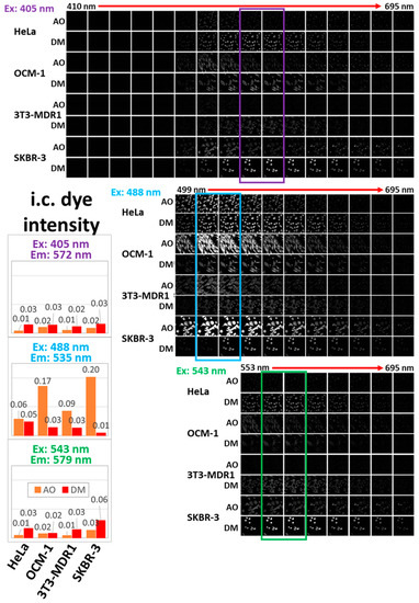 Cells were seeded in ibidi slide (8-well ibidi µ-Slide, Zenon Bio Kft, Szeged, Hungary) at a concentration of 30,000 cells/well and the next day labeled with 2.5 × 10−6 M AO and DM for 2 h. Then, fluorescence and bright field 16-bit images were taken by a Zeiss LSM 880 confocal microscope (Carl Zeiss microscopy Gmbh, Oberkochen, Germany) using a ×40 C-Apochromat water immersion objective applying 405, 488, and 543 nm laser excitation and blue (410–474 nm), green (499–540 nm), and red (554–629 nm) emission channels. For spectral imaging, the same wavelengths excitation laser lines were applied, and total emission ranges at the three excitations were 410–695, 499–695, and 553–695 nm, respectively. A fair number of images were made at every 18-nm span with a 32-channel linear detector system in these broader ranges.