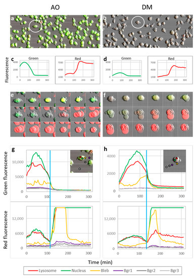 17]. Another interesting phenomenon suitable for studying lysosomal membrane integrity in live cells is the AO-sensitized photodestruction of lysosomes. In living cells with adequate metabolic activity, besides staining RNA green, AO accumulates in lysosomes. Concentrated AO in lysosomes also forms dimers, causing the characteristic metachromatic shift of the emission spectrum and stains lysosomal vesicles red. When cells are exposed to blue light, AO-generated radicals damage the lysosomal membrane; red vesicles turn to green firework-like flashes by exploding spectacularly as concentrated AO dilutes into the cytosol [