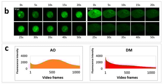 The excitation and emission spectra were recorded in a quartz cuvette of 1.0 cm optical length using a Jasco FP-8200 fluorescence spectrophotometer (JASCO Corporation, Tokyo, Japan), equipped with a Xe lamp light source. Data were recorded at 20 °C, using 2.5 nm excitation, 5.0 nm emission bandwidths, and 200 nm/min scanning speed at “normal” sensitivity. First, we recorded all spectra of solutions containing one million HeLa cells/mL labeled with 2.4 × 10−6 M AO or 2.5 × 10−6 M DM. Then, in control experiments, these parameters were recorded with the same settings but without the cells.