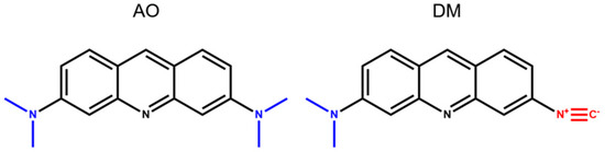 15]. These acridine derivatives showed altered properties compared to AO, such as reduced basicity, enhanced solvatochromic emission range, low quantum yield in water, and easy tuning of their fluorescent behavior by complexation with metal ions. It was also shown that among these novel derivatives, the 3-N,N-dimethylamino-6-isocyanoacridine (DM) has the most favorable properties in terms of excitation wavelength, fluorescent emission range, and preserving the original cell morphology. AO, compared to DM, being a symmetric molecule, can be considered almost nonpolar, especially in the ground state. In contrast, the substitution of one of the electron-donating (D) dimethylamino groups of AO (