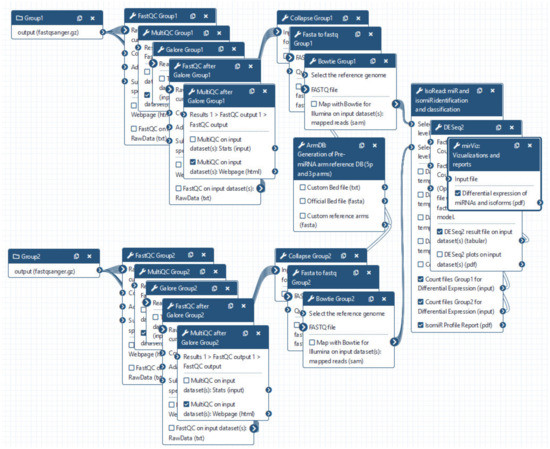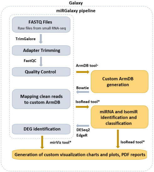 miRGalaxy is a Galaxy-based framework integrating curated state-of-the-art NGS tools extended with three new tools dedicated to miR and isomiR identification, classification, and expression assessment. miRGalaxy is built on the top of the Galaxy Docker image (Galaxy version 20.09) as a flavor instance. The advanced miRGalaxy workflow is shown in Figure 1. The workflow comprises well-known steps for data quality control (QC), read rimming, mapping, and DE (shown in grey) supported by default Galaxy tools—FastQC (v0.72) [14], MultiQC (v1.9) [15], TrimGalore (v0.6.3) [16], Bowtie (v1.2.0) [17], and DESeq2 (v2.11.40.6) [18]/EdgeR (v3.24.1) [19,20], respectively. Data processing intended to identify RefSeq miRs and template/non-template isomiRs is executed by two new tools—ArmDB and IsoRead. As a final step of the workflow, another new dedicated tool—miRViz, provides users with PDF reports, in which outputs are collected and visualized with custom charts. The newly developed Galaxy tools were written in Python 3.7.4. The following libraries—fpdf (v1.7) [21], numpy 1.17.3 [22], pandas 1.0.3 [23], matplotlib 3.1.2 [24], and logomaker 0.8 [25] were used for tool implementation and graph rendering.