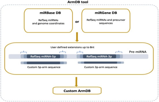 Overview of ArmDB tool. The tool can use data from miRBase or miRGene DBs to generate a custom database with 5′- and 3′-arm sequences used as a reference for read mapping in downstream analysis. The arms can be generated with user-defined nucleotides extension of the RefSeq sequences (up to 8 nt).