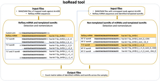 The second newly developed tool—IsoRead is aimed at identifying and classifying RefSeq miRs and isomiRs in sequencing reads (Figure 3). The main isomiR types incorporated in the algorithm are: (i) template isomiRs whose ends are offset from the corresponding ends of the RefSeq miR-5′-shifted with one or more nt (5′-isomiRs), 3′-shifted with one or more nt (3′-isomiRs), 5′- and 3′-shifted with one or more nt (5′3′-isomiRs); and (ii) non-template isomiRs (non-template additions at the 3′-end of the RefSeq miR up to 3 nt).