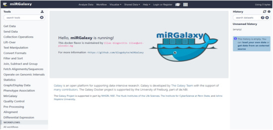 As Galaxy, miRGalaxy is production-ready, pre-configured, and preinstalled with all required tools needed for the analysis. The image will be automatically downloaded and deployed for miRGalaxy with a ready-to-run analysis platform. Additionally, if the user already has local Galaxy and wants to use our workflow and tools within its own running instance, the user can install only the tools (ArmDB, IsoRead, and miRViz) from the Galaxy Toolshed [30] An archive of the Dockerfile and workflow files can be downloaded from the Github repository at https://github.com/Glogobyte/miRGalaxy.